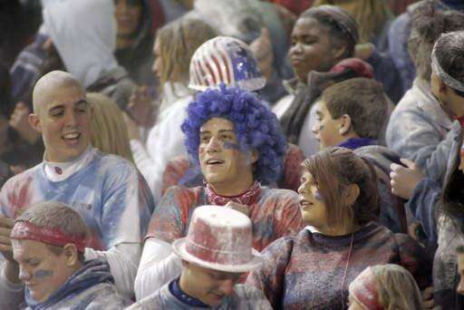 Jacobs’ Hunter Williams greets Jake Gierlak in the end zone after a touchdown.