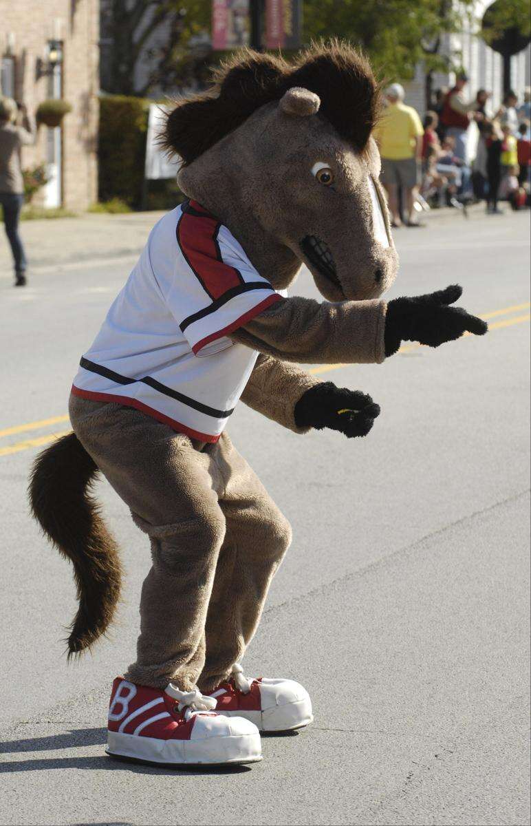 The Bronco mascot entertains children during the Barrington High School Homecoming parade.