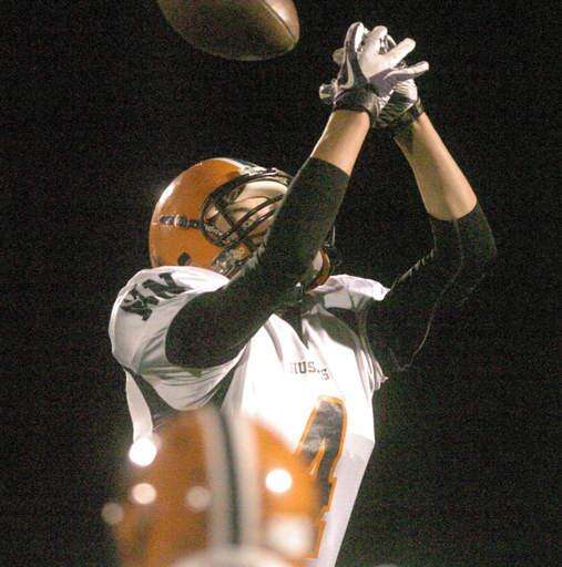 Mikey Dudek of Neuqua pulls down a pass while Danny Schertz of Naperville North tries to stop him.