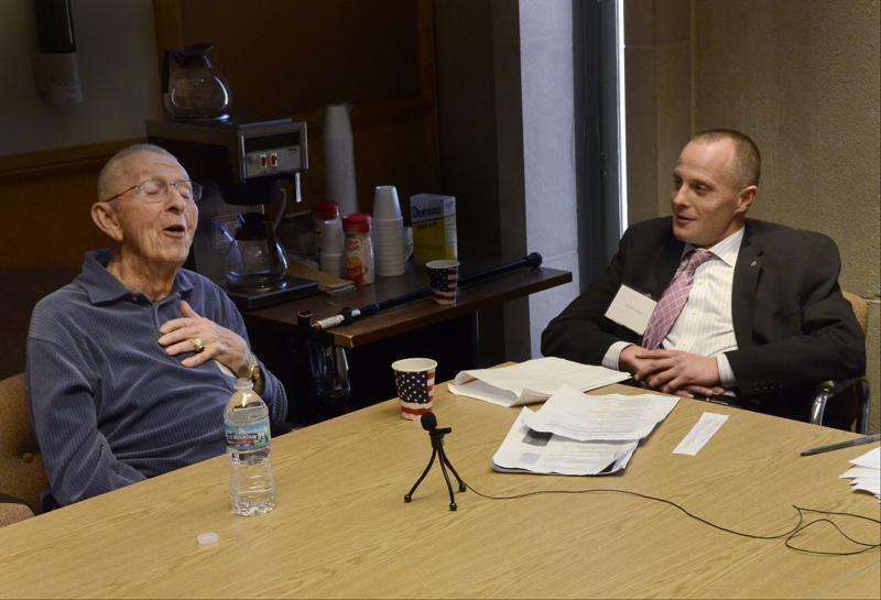 World War II and Korean War Navy veteran Daniel Reese of Round Lake recalls some of the funnier moments of his service while talking with Assistant Public Defender Tim MacArthur. Members of the legal community met with combat war veterans at the Lake County Courthouse to help record their stories for the Library of Congress. Bill Zars/bzars@dailyherald.com