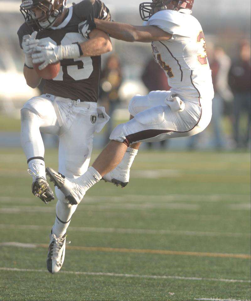 Dimitri Taylor of Montini shakes off Keith Craig of Joliet Catholic Academy during the Montini at Joliet Catholic game in Class 5A football semifinal action.