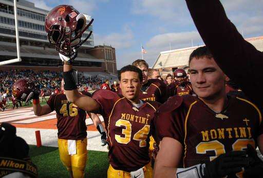 Montini quarterback Alexander Wills (6) gets hoisted in the air by teammate David Sarkan (66) after their win over Morris in Saturday’s Class 5A state title game at Memorial Stadium in Champaign.