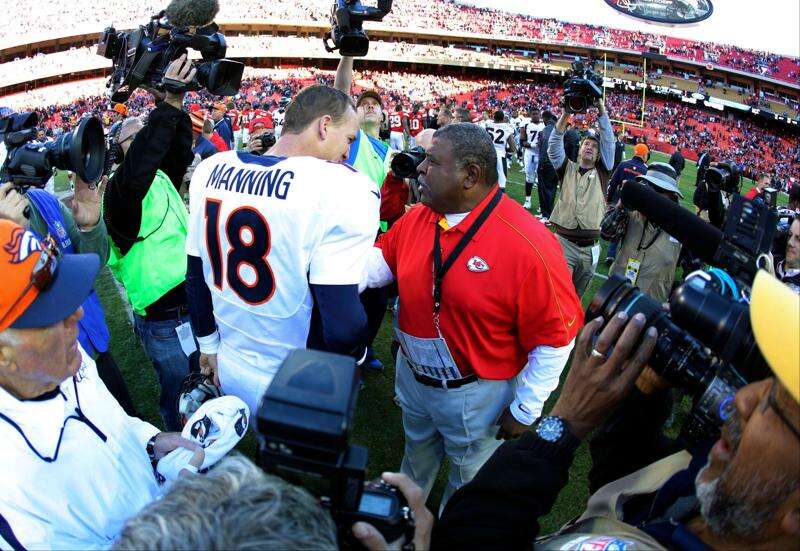 Denver Broncos quarterback Peyton Manning talks Sunday with Kansas City Chiefs coach Romeo Crennel following the Broncos 17-9 win Sunday. Associated Press