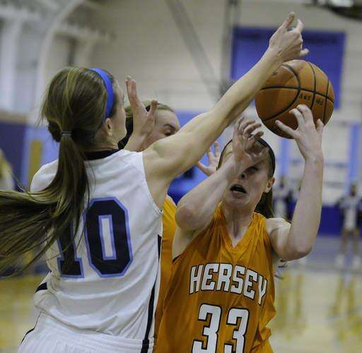 Prospect’s Catherine Sherwood battles for the ball with Hersey’s Ashley Raulli and Sara Bayerle.