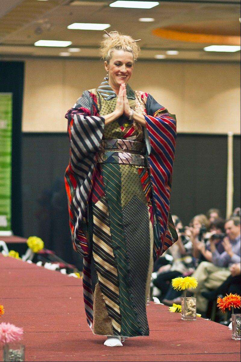 For Mulan, designer Kim Blackburn, of Barrington, created this outfit, modeled by Karen Borchert, from ties that were donated to her by a friend. The Chinese knot hair accessory is also made from ties and the toe slippers are made from an old T-shirt.