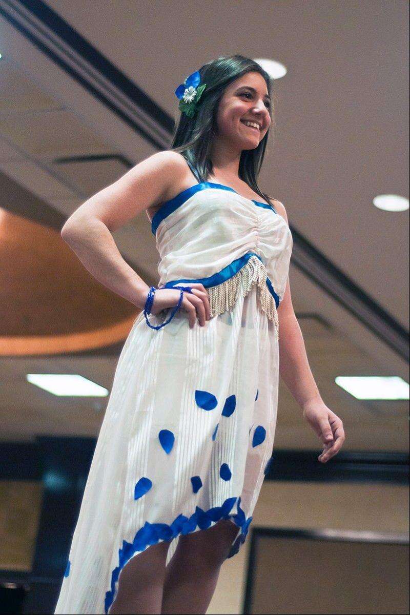 Pocahontas is ready to set out on a new adventure, wearing a dress made from brown paper grocery and plastic shopping bags. Accessories include a belt made of felt and headband and earrings made with feathers from a school project. This outfit was designed by Sara Perlin, Lauren Rosenwinkel, Linda Yoon and Valentina Carrero, students at Fremd High School in Palatine. It is modeled by Valentina Carrero.