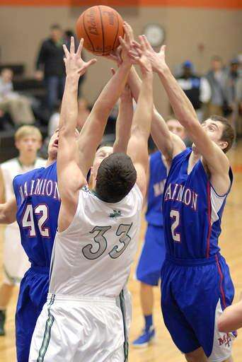 Marmion’s Jordan Glasgow and Jake Ruddy leap for a rebound with Geneseo’s Grant Burress in the first quarter of the DeKalb tournament on Saturday, December 22.