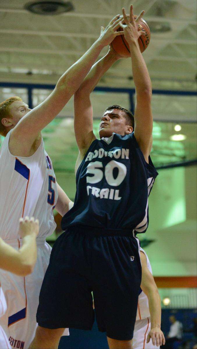 Simon Jakublzak of Addison Trail,left, and Zach Jakalski of Fenton go up for a rebound.