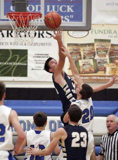 Westminster Christian guard Colin Brandon goes to the hoop as Harvest Christian’s Jon Vislisel tries to put the stop on.