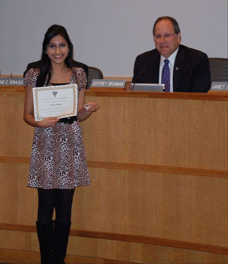 Nisa Khan serves at her school as Interact Community Service Club president, National Honor Society secretary, Relay For Life Committee head, a Freshman Advisory leader, Class Board member, and Spanish Honors Society member. She has been strongly influenced by her parents and grandfather, whose battle against cancer is the impetus she credits for her passion in participating at Relay For Life.