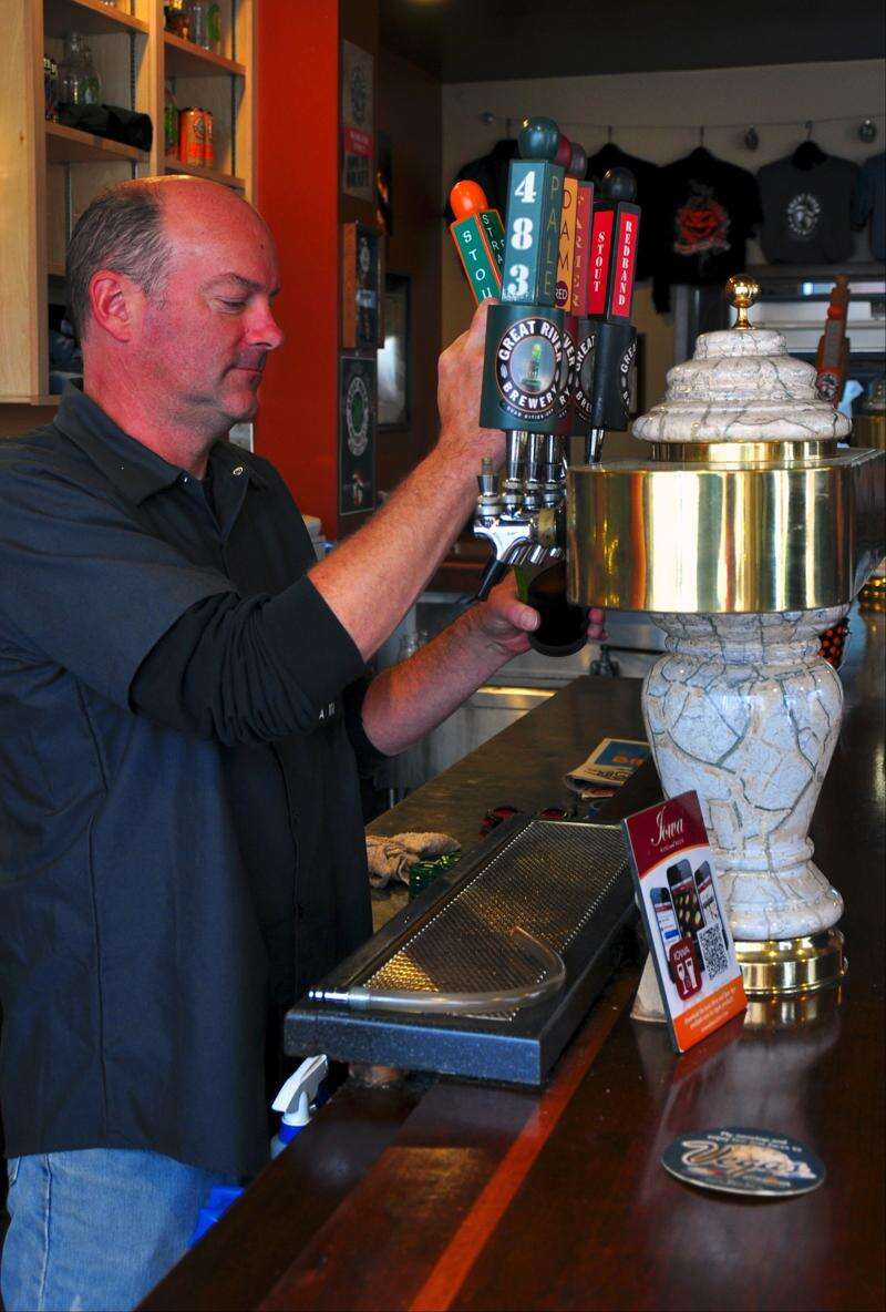 Dann Cornelis mans the taps in the Brewer’s Lounge at Great River Brewery in Davenport, Iowa. Photo by Katherine Rodeghier