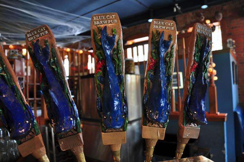 Handles on the tap at Blue Cat Brew Pub in Rock Island are decorated with the figure of a blue catfish, the pub’s namesake. Photo by Katherine Rodeghier