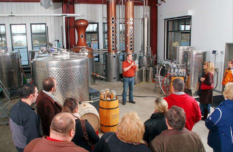 Garrett Burchett takes visitors on a tour of Mississippi River Distilling Co., a micro-distillery he and his brother opened in Le Claire, Iowa. courtesy of Mississippi River Distilling Co.