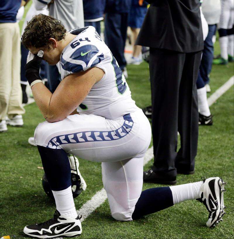 Seattle Seahawks guard J.R. Sweezy reacts to the after an NFC divisional playoff NFL football game against the Atlanta Falcons Sunday, Jan. 13, 2013, in Atlanta. The Falcons won 30-28. Associated Press