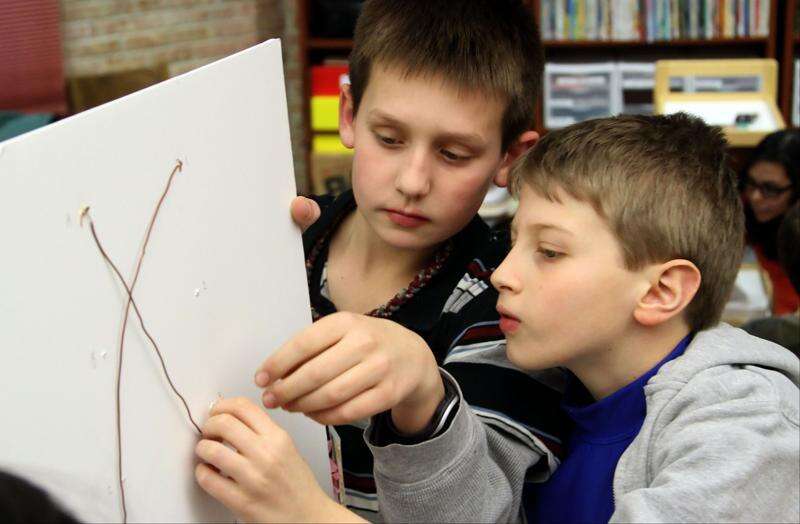 Ryan Mount, 12, left, an Connor Byrne, 9, both of Lindenhurst, build a game with circuits as they learn about endangered and invasive species during a program called The Nature of Things at Lake Villa District Library Tuesday. Steve Lundy/slundy@dailyherald.com
