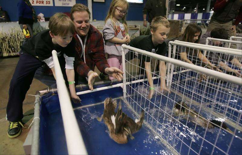 Patrick Quill, of Schaumburg, left, and his son, Brian, 10, let their duck go at the start of the Great American Duck Races during the Chicago Outdoor Sports Show Sunday at the Donald E. Stephens Convention Center in Rosemont. The family event featured wildlife exhibitions, fishing demonstrations, duck races, archery ranges and more. Gilbert R. Boucher II/gboucher@dailyherald.com
