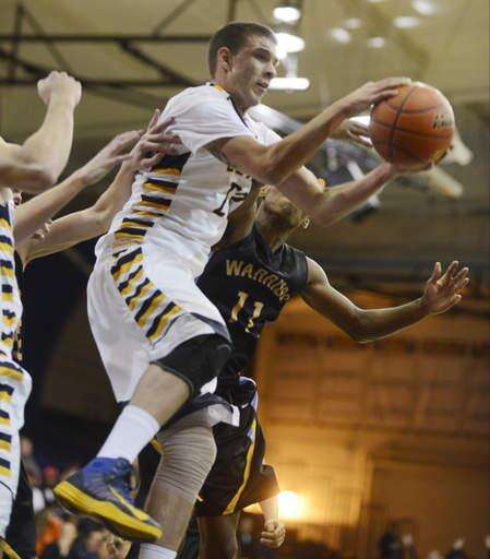 Leyden’s Jonny Woolf, left, takes a shot against the Maine West defense, including Allante Bates .