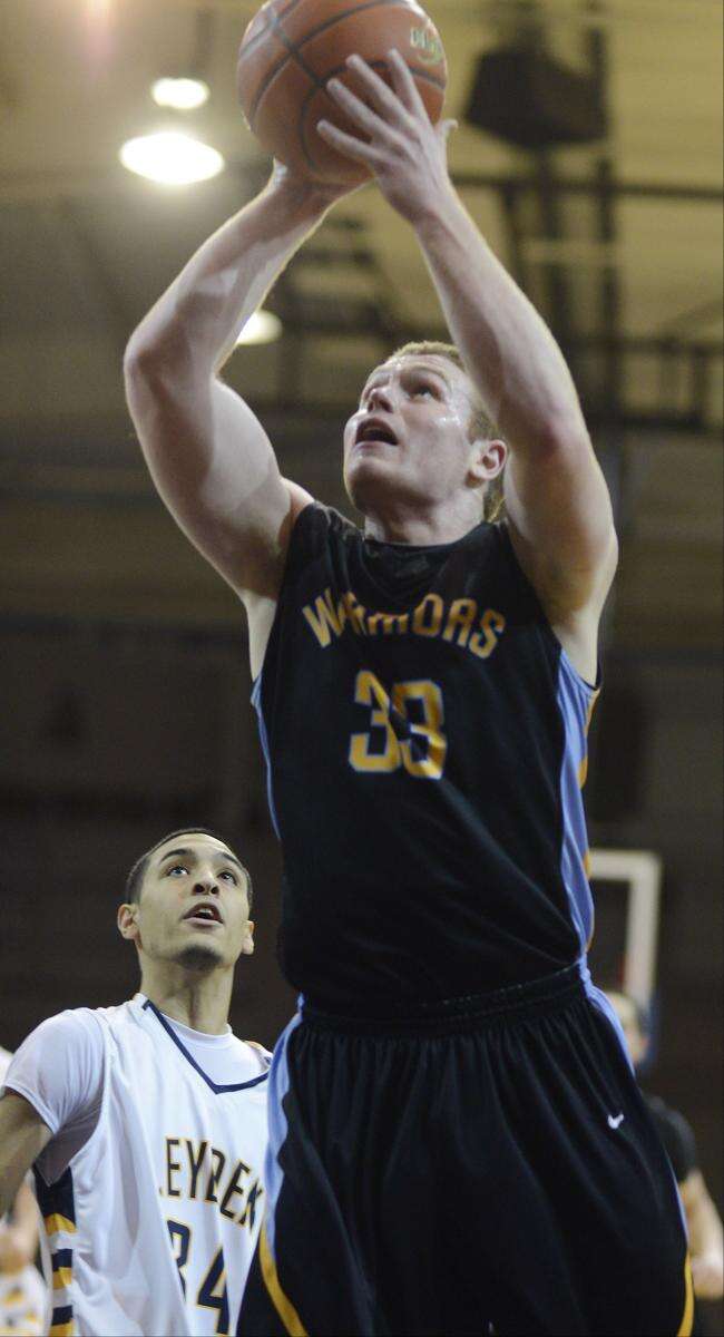 Leydens Jonny Woolf, left, takes a shot against the Maine West defense, including Allante Bates .