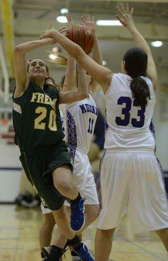 Jenny Vliet of Rolling Meadows draws contact from Fremd’s Haley Gorecki as she nears the basket.