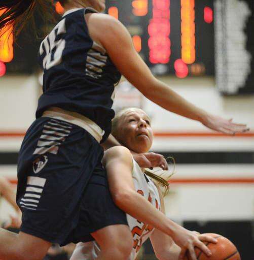 St. Charles East’s Amanda Hilton is fouled by Lake Park’s Nicole Tsiodras. John Starks | Staff Photographer
