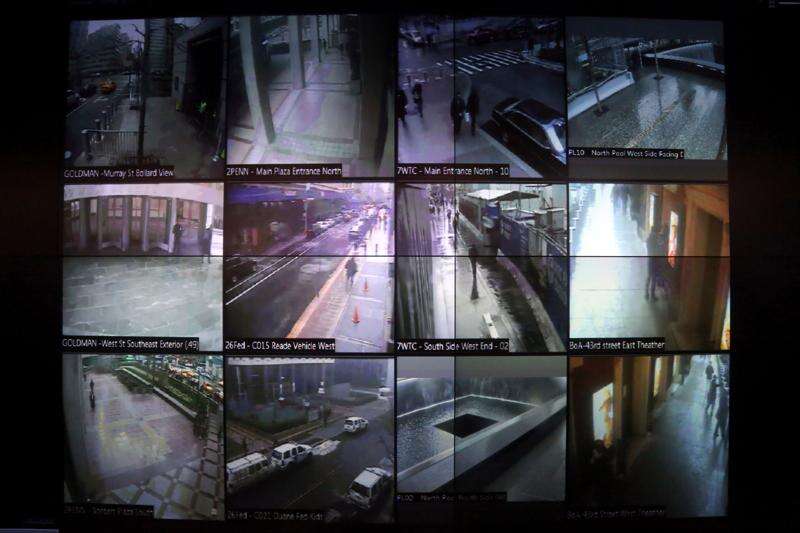 This Tuesday, Feb. 19, 2013 photo shows a detail of a video wall showing New York city police officers an interactive map of an area in the city, security footage from nearby cameras, if there are high radiation levels and whether any other threats have been made in New York. Associated Press