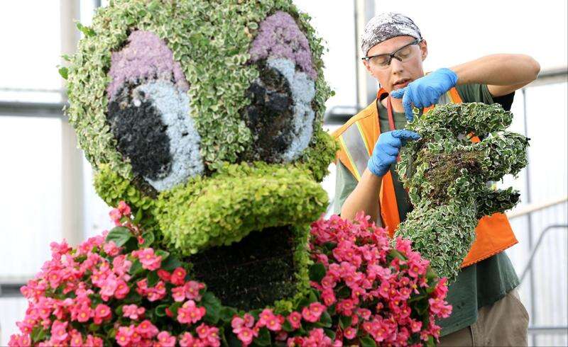A topiary specialist works on a Daisy Duck topiary at the Epcot front entrance during the 20th Epcot International Flower & Garden Festival at Walt Disney World Resort in Lake Buena Vista, Fla. Courtesy of Disney