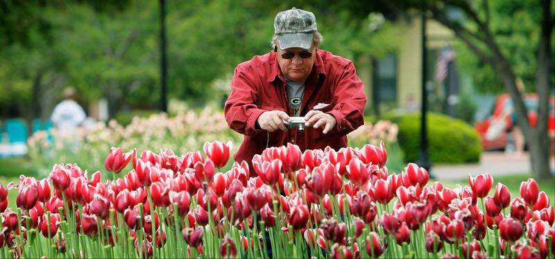 Bud Moe, of Barron, Wis., takes pictures of tulips on display during the annual Pella Tulip Time festival in Pella, Iowa. Associated Press