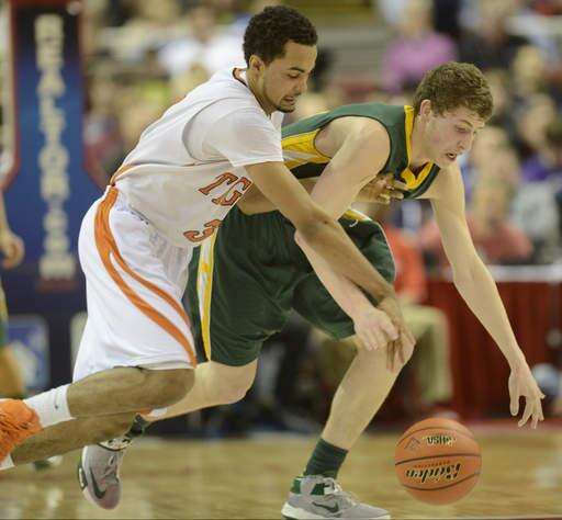 Stevenson’s Andrew Stempel, right, takes the ball from Edwardsvill’e Tre’ Harris.