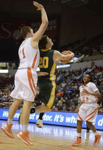 Stevenson’s Connor Cashaw drives to the basket against Edwardsville’s Drew Curtis.