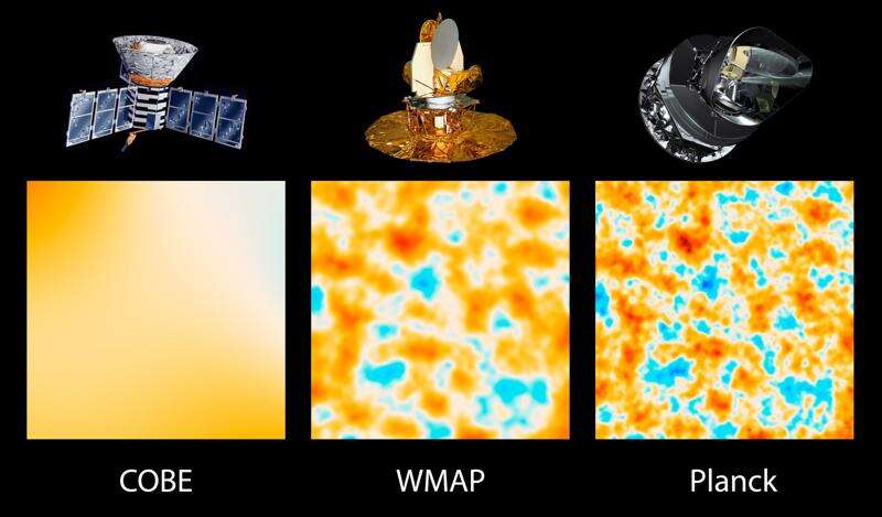 This image released on Thursday March 21, 2013 by the European Space Agency (ESA) in Paris shows from left , the evolution of satellites designed to measure ancient light left over from the Big Bang that created our universe 13.8 billion years ago. Called the cosmic microwave background, this light reveals secrets of the universe's origins, fate, ingredients and more. The three panels show 10-square-degree patches of all-sky maps created by space-based missions capable of detecting the cosmic microwave background. The first spacecraft, launched in 1989, is NASA's Cosmic Background Explorer, or COBE on left, the second satellite the Wilkinson Microwave Anisotropy Probe, or WMAP, centre, was launched in 2001 and the third satellite Planck, a European Space Agency mission with significant NASA contributions. was launched in 2009,(AP Photo/ESA Planck Collaboration)
