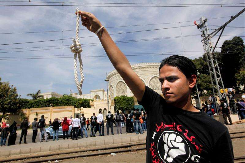 Associated PressA member of Egypt’s April 6 Youth Movement holds a noose in front of the presidential palace in Cairo, Egypt, Saturday, April 6. The group is rallying to mark its fifth anniversary and to protest against President Mohammed Morsi.