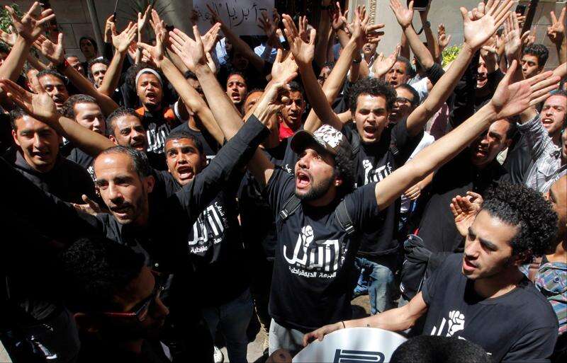 Associated PressMembers of Egypt’s April 6 Youth Movement shout anti-Muslim Brotherhood slogans during a rally in front of Cairo’s stock market Saturday, April 6. The group is rallying to mark its fifth anniversary and to protest against President Mohammed Morsi. Arabic on T-shirts reads, “6th April.”