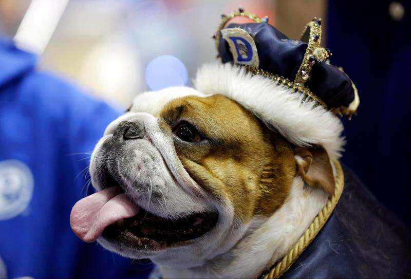 Huckleberry sits on the throne after being crowned the winner of the 34th annual Drake Relays Beautiful Bulldog Contest, Monday, April 22, 2013, in Des Moines, Iowa. The bulldog is owned by Steven and Stephanie Hein of Norwalk, Iowa. The pageant kicks off the Drake Relays festivities at Drake University where a bulldog is the mascot.