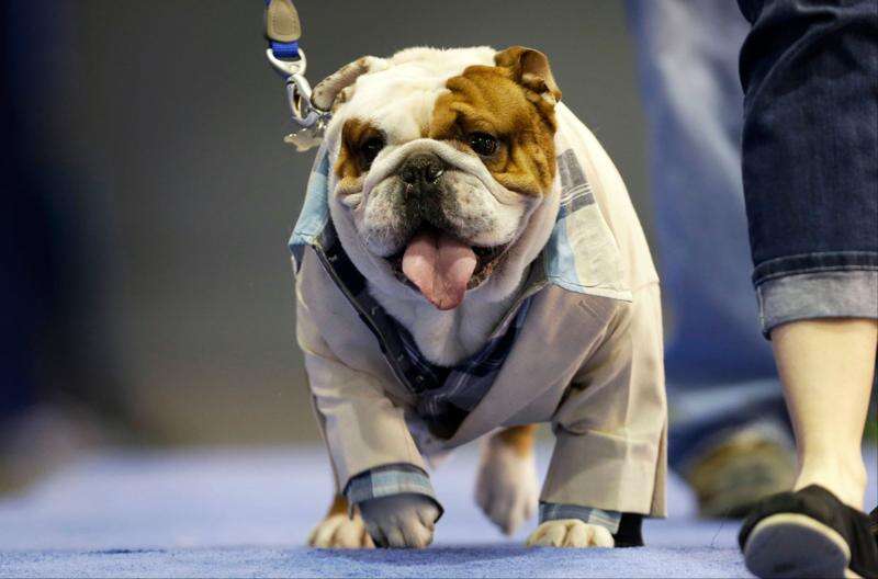 Huckleberry walks across stage before being crowned the winner of the 34th annual Drake Relays Beautiful Bulldog Contest, Monday, April 22, 2013, in Des Moines, Iowa. The 4-year-old pup bulldog is owned by Steven and Stephanie Hein of Norwalk, Iowa. The pageant kicks off the Drake Relays festivities at Drake University where a bulldog is the mascot.