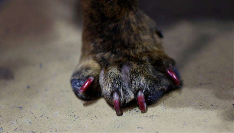 Fat Amy shows off her painted nails during the 34th annual Drake Relays Beautiful Bulldog Contest, Monday, April 22, 2013, in Des Moines, Iowa. The pageant kicks off the Drake Relays festivities at Drake University where a bulldog is the mascot.