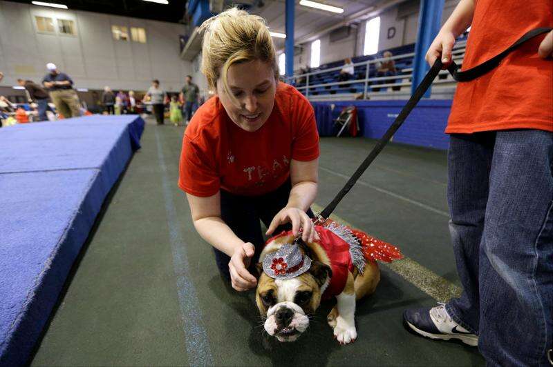 Laura Kares, of Omaha, Neb., puts a hat on her bulldog Molly during the 34th annual Drake Relays Beautiful Bulldog Contest, Monday, April 22, 2013, in Des Moines, Iowa. The pageant kicks off the Drake Relays festivities at Drake University where a bulldog is the mascot.