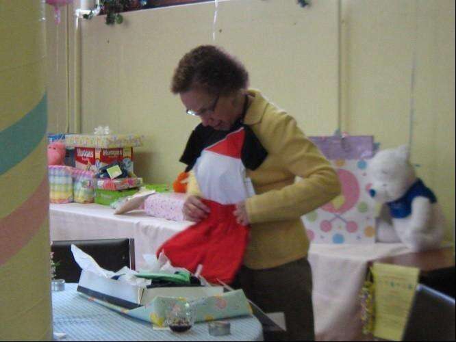 St. Philip’s parishioner Judy Zawacke shows off one of the many items donated to the Baby Closet during the shower. Courtesy of St. Philip’s Episcopal Church