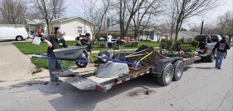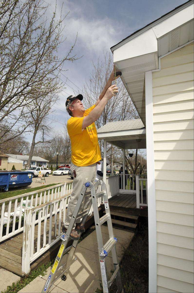 During the first day of the 20th annual April rebuilding event on Friday, 36 groups of volunteers from Aurora-area churches, corporations, service groups and trade organizations converged near Grand Boulevard and Calhoun Street to repair homes for low-income or elderly occupants. Safety, energy efficiency, accessibility and beautification work continues Saturday.