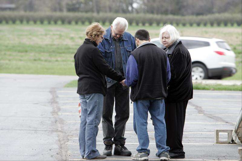 Lynette Ohse of St. Charles, from left, Don Gorder of Huntley, George Delask of DeKalb and Char Sportsman of St. Charles share a prayer Thursday at Country Evangelical Covenant Church in Campton Hills. The church hosted a Drive-Through prayer service in its parking lot at McDonald Road and Route 47 on the National Day of Prayer.