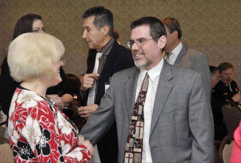 Keynote speaker Rev. David Sitler from the Glen Ellyn Seventh-day Adventist Church chats with hospital chaplain Debra Hill at ThursdayÂ’s National Day of Prayer breakfast in Glendale Heights. Scott Sanders/ssanders@dailyherald.com