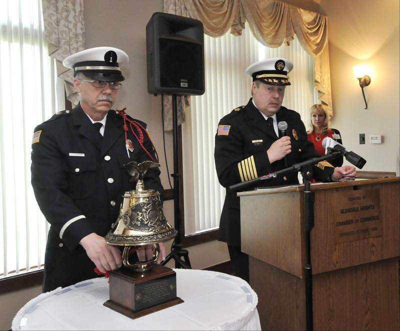 To honor fallen firefighters and other first responders, Glenside Fire Department Lt. Bob Garon, left, rings a memorial bell, while Chief Russ Wood reads a list of those honored. Scott Sanders/ssanders@dailyherald.com