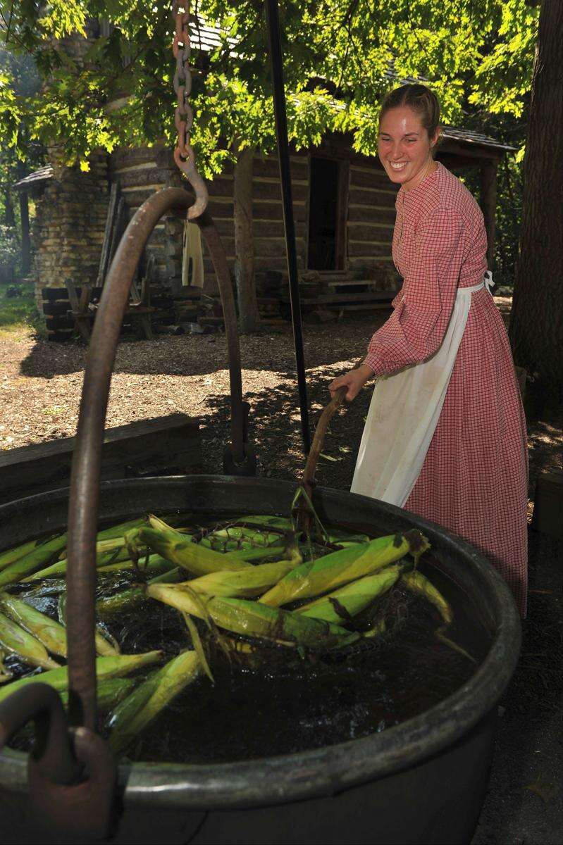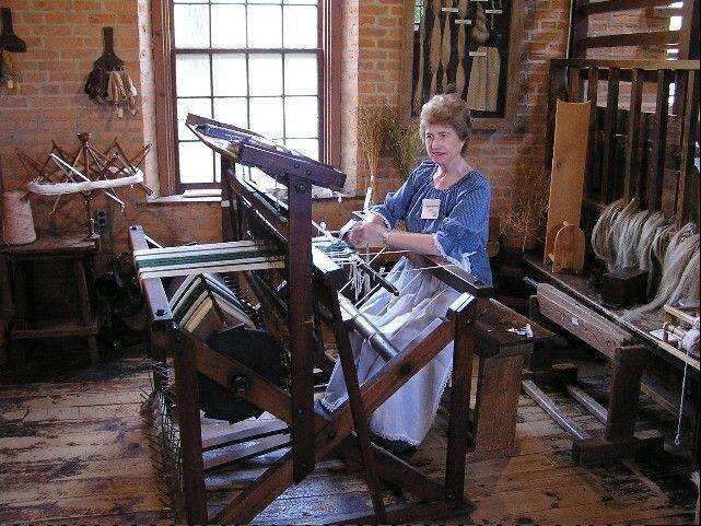 Costumed interpreters also use a spinning wheel and loom, both 100 years old, to make yarn and weave cloth as they would have in the mid-19th century. “You see people using these great pieces of pioneer technology,” she said.