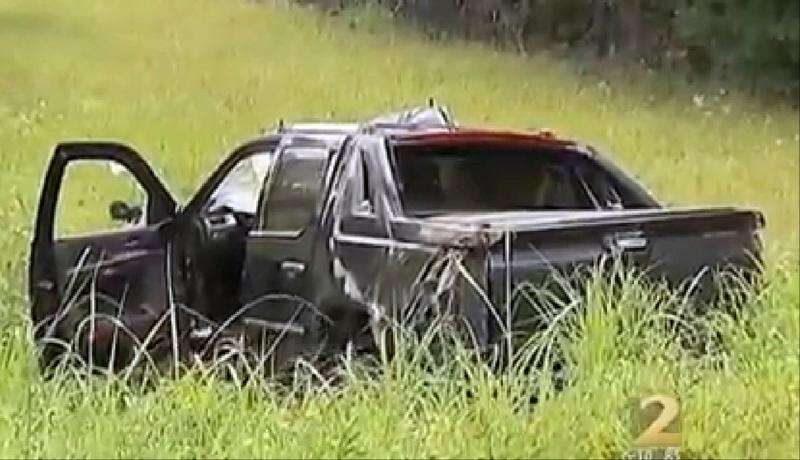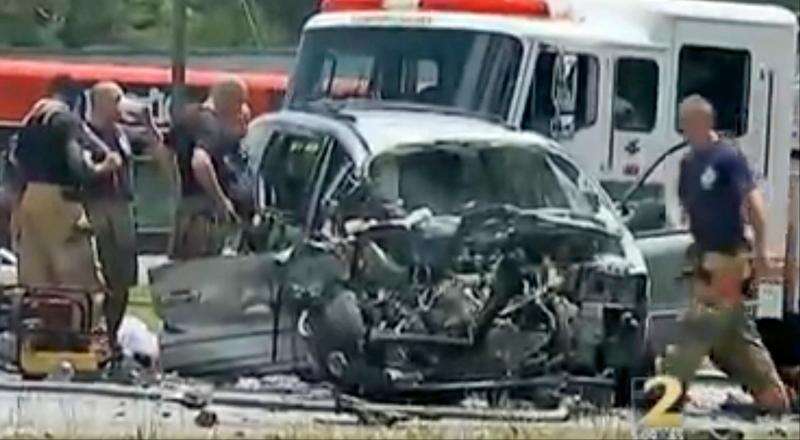 In this image taken from video, an SUV sits off road at the scene of a car crash Friday, May 31, 2013, in Jonesboro, Ga. Former NBA All-Star guard Daron "Mookie" Blaylock was on life support at a hospital Friday after his SUV crossed the center line and crashed head-on into a van in suburban Atlanta, police said. Clayton County (Ga.) police spokesman Clarence Cox says the man and woman riding in the van were also injured and to the hospital. Their names and conditions were not immediately available. (AP Photo/WSB-TV) MANDATORY CREDIT