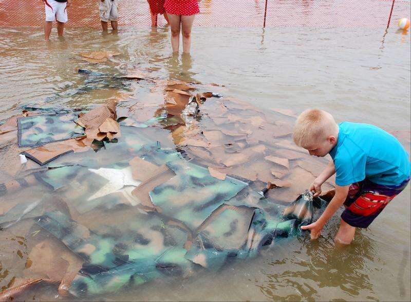 Jotham Becker, 7, of Crystal Lake plays with the remnants of the Go Commando team boat at the 29th annual America’s Cardboard Cup Regatta. The event took place Saturday at Crystal Lake’s Main Beach. Emmalee Luckas/eluckas@dailyherald.com