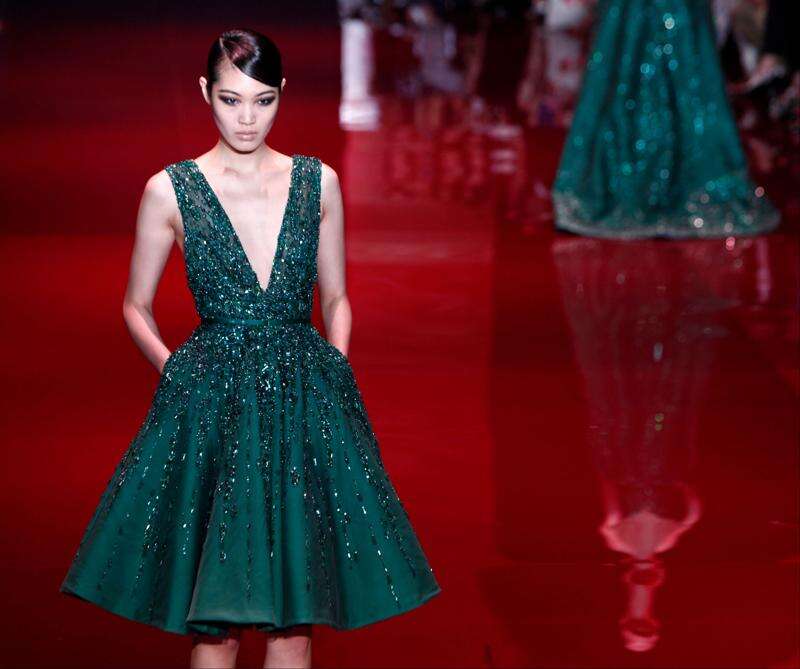 PARIS) — Lebanese designer Elie Saab unabashedly celebrated the glitz of the red carpet in a fall-winter 2013 couture show which used the exact mid-red color the A-listers tread.