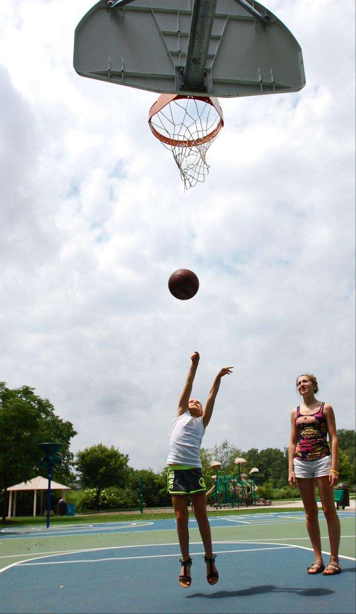 Christine Kelly, 8, of Geneva, and Jessica Theis, 20, of Batavia, play basketball at Braeburn Park in Batavia Monday.