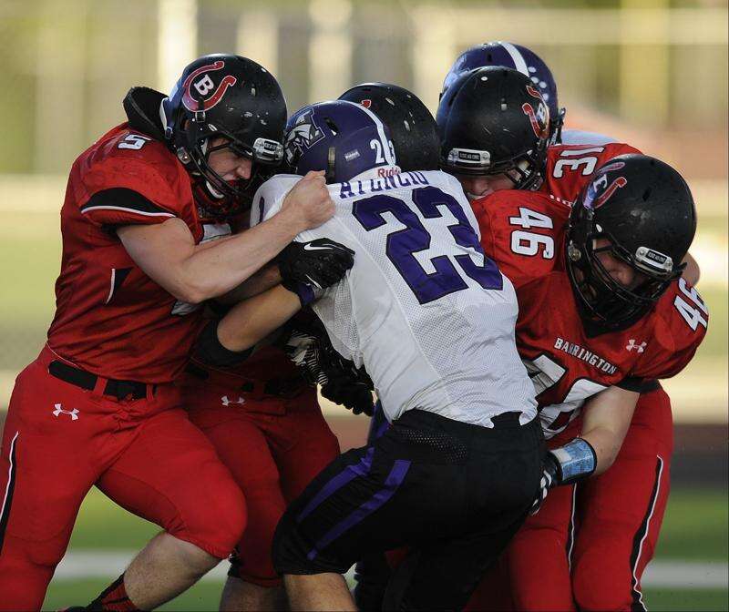 Barringtons Colin Castagna brings down Rolling Meadows quarterback Bobby Suchecki.