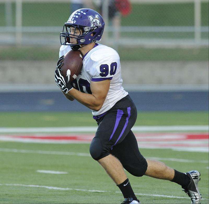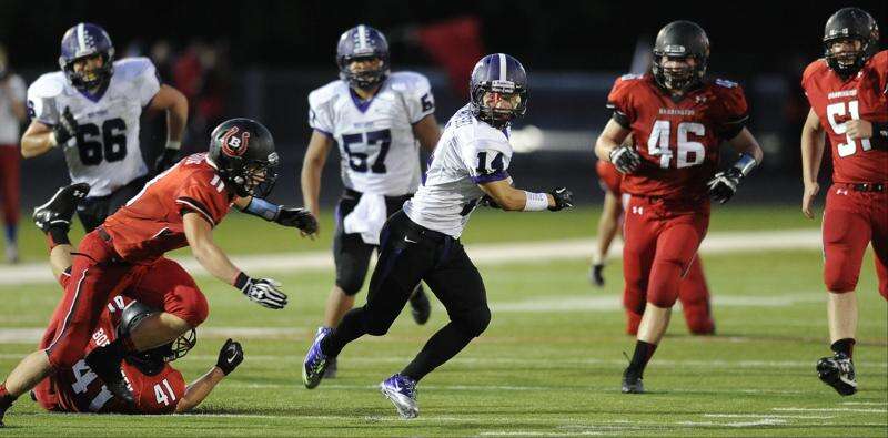 Rolling Meadows Jack ONeill runs for a touchdown in the second quarter on a pass play under pressure from Barringtons J. P. Brooks.