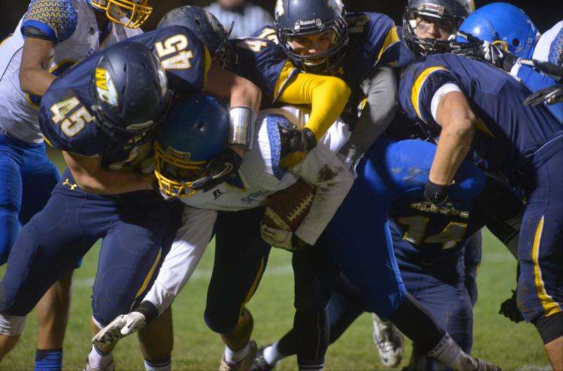 Neuqua Valleys Mikey Dudek tries to make a catch under pressure during Saturdays playoff game in Naperville.