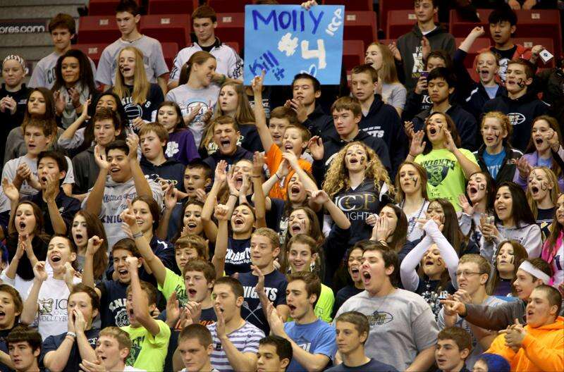 IC Catholic fans cheer on their team in the Class 2A championship girls volleyball match on Saturday in Normal.